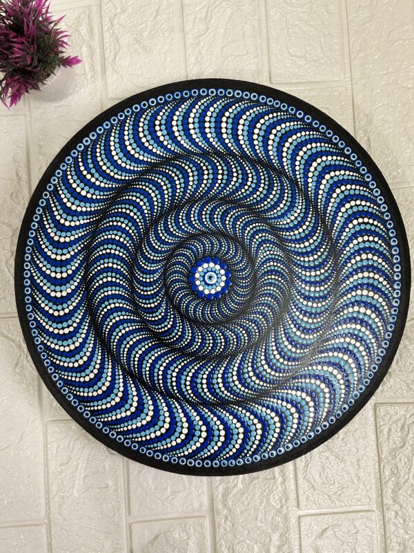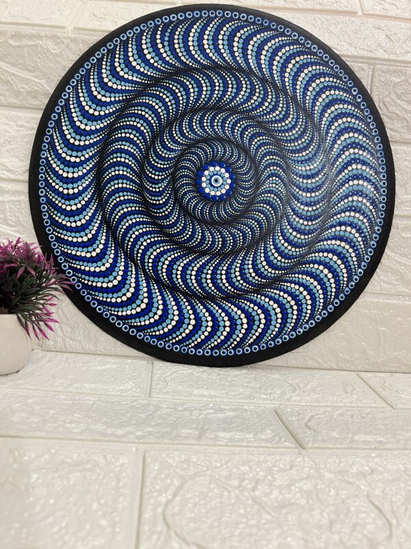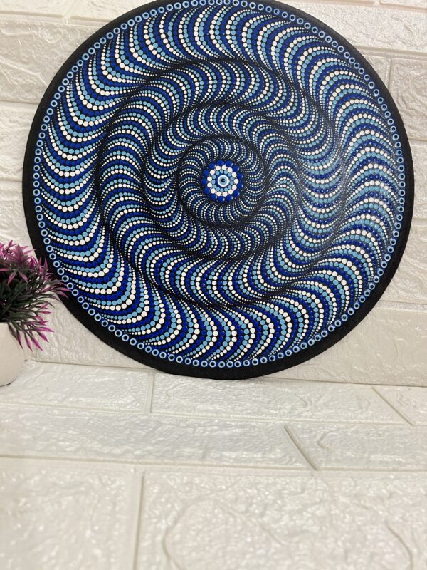 A mesmerizing Evil Eye themed mandala, designed with intricate blue, white, and black dot patterns symbolizing protection and positive energy. The spiral formation creates a captivating illusion effect, giving the artwork a dynamic 3D depth that seems to move as you gaze at it. Inspired by the traditional Nazar, it’s believed to ward off negativity and invite peace and clarity. The harmonious shades of blue radiate calmness, making this piece a perfect blend of art, geometry, and spiritual symbolism.