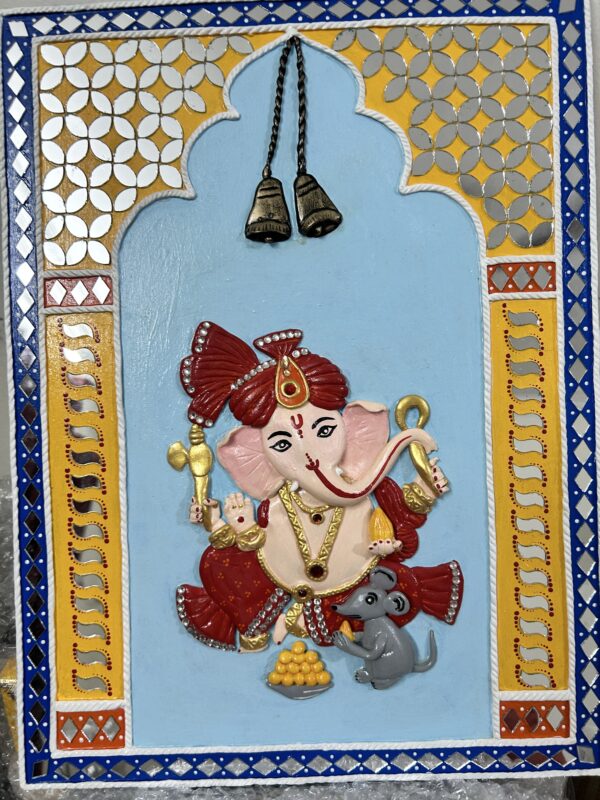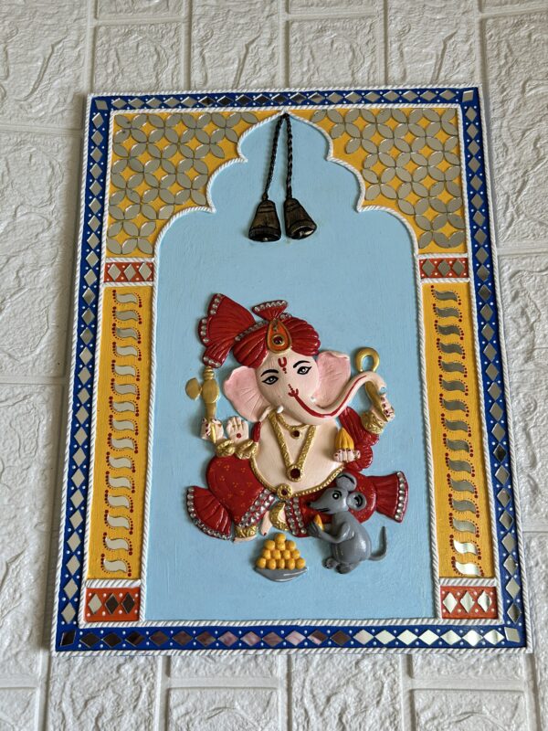 A beautifully handcrafted Ganesha mural jharokha painting, showcasing Lord Ganesha in vibrant red attire seated gracefully within a traditional arch design. The artwork is adorned with mirror work and intricate lippan-inspired patterns, highlighted with touches of gold and royal blue. Two antique-look bells add a divine charm to the piece, while Ganesha’s companion, Mooshak raj, completes the spiritual scene. Perfect for bringing auspicious energy and artistic elegance to any space.