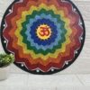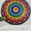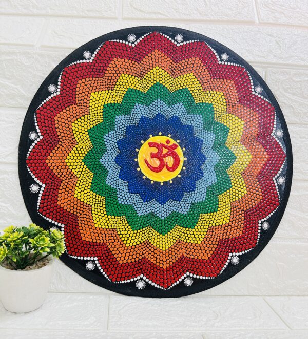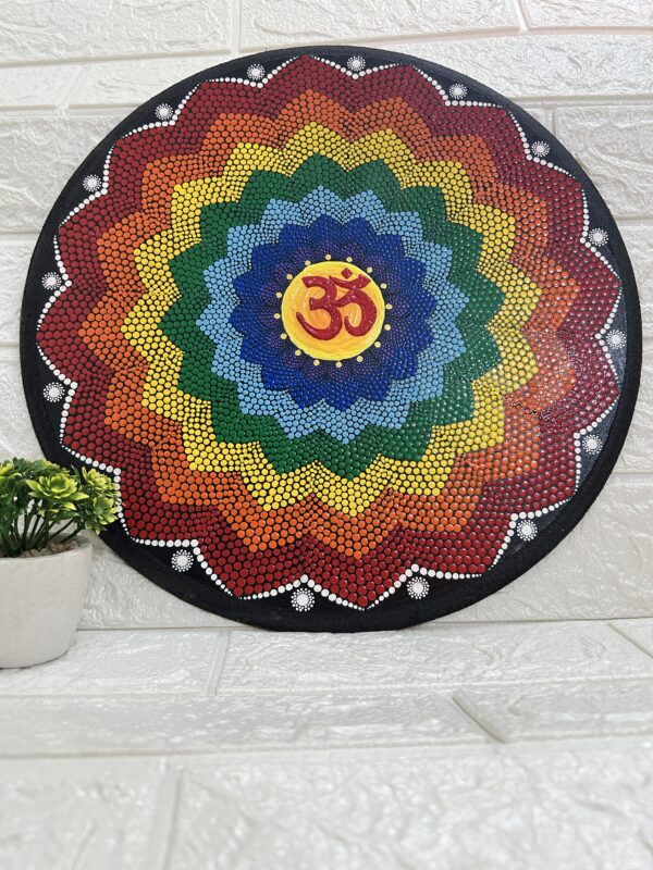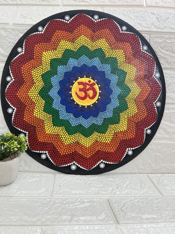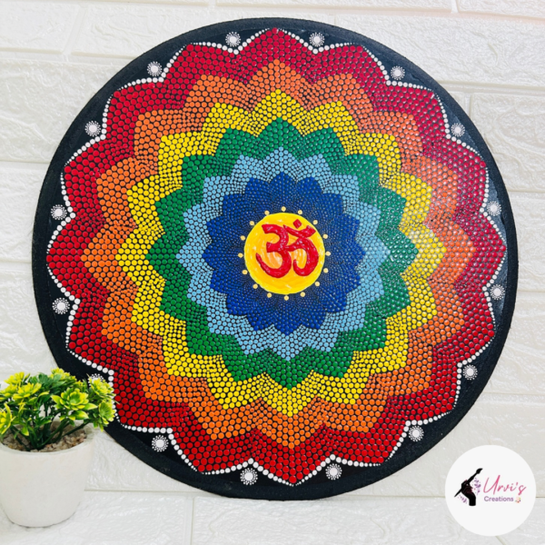 A vibrant geometrical rainbow mandala radiating positivity and balance. Each meticulously dotted layer flows seamlessly from violet to fiery red, symbolising the harmony of all chakras and the energy of life itself. At the center, the glowing Om symbol represents universal connection and spiritual awakening. This colourful creation blends symmetry, spirituality, and joy — a true celebration of divine energy through art.