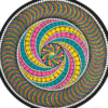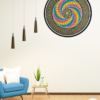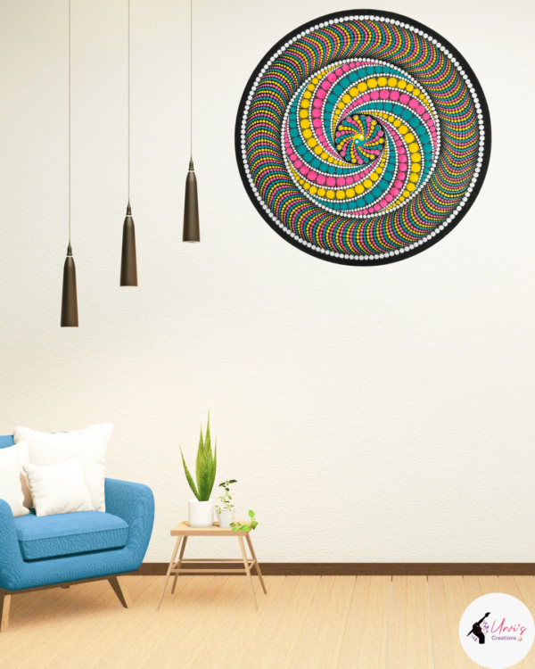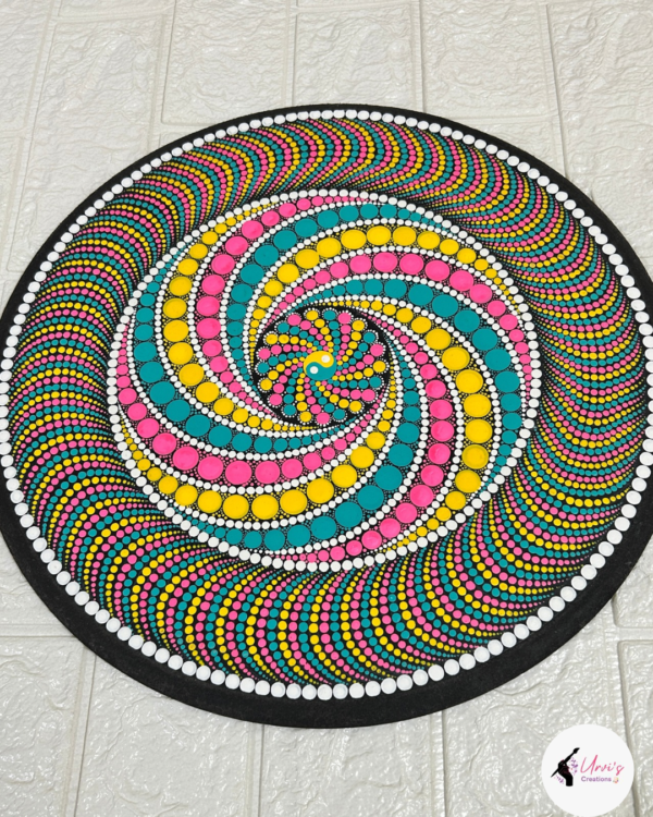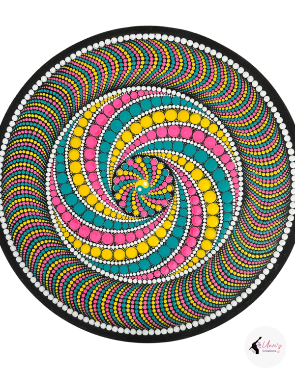 A mesmerizing geometrical 3D Mandala created with vibrant dot patterns in pink, yellow, teal, and white. The spiral design draws the eye inward, symbolizing energy flow and balance. Each precisely placed dot adds depth and motion, creating an illusion of rotation and rhythm. Set on a black base, this mandala radiates positivity, harmony, and modern vibrance — a perfect blend of geometry and mindfulness in art.